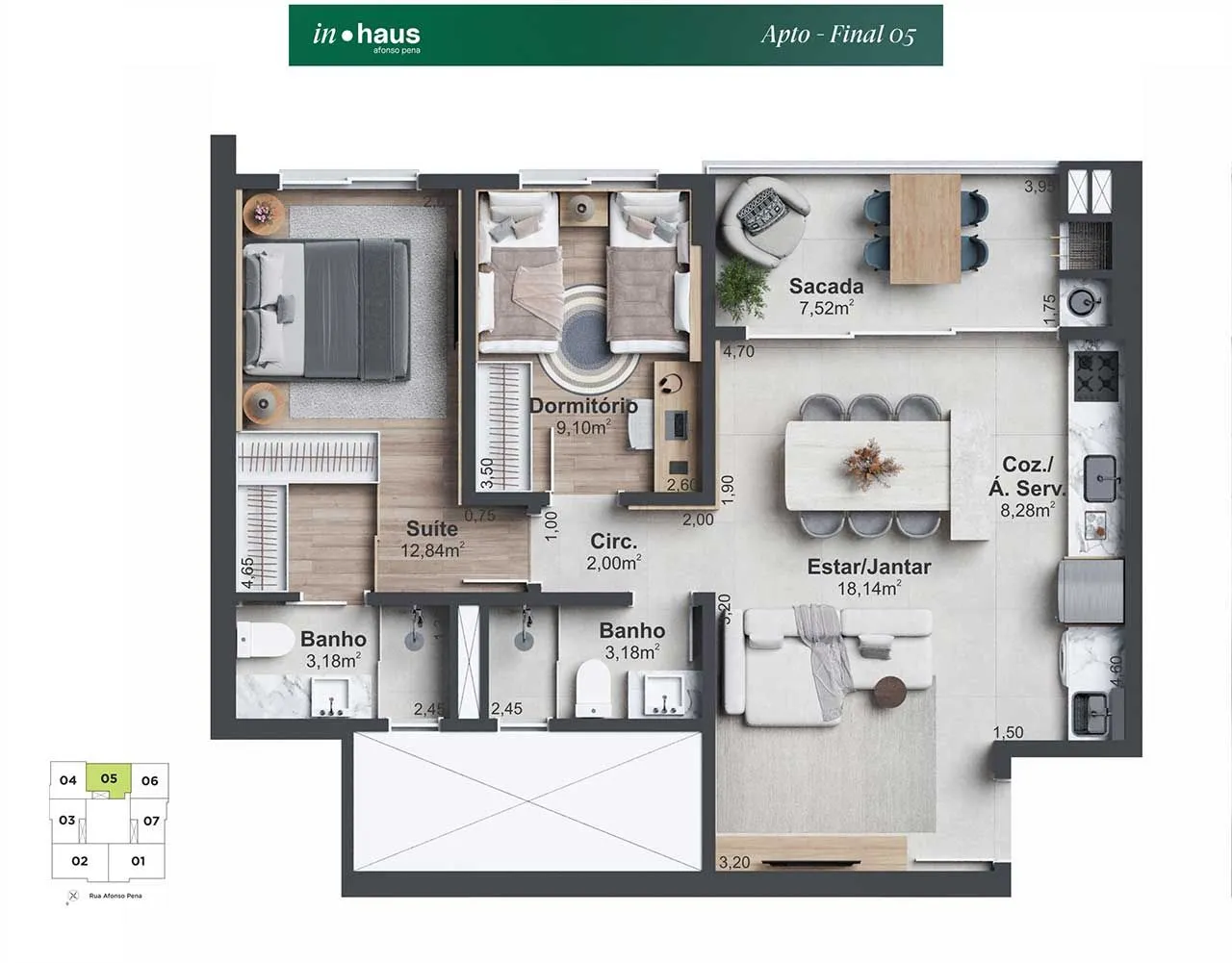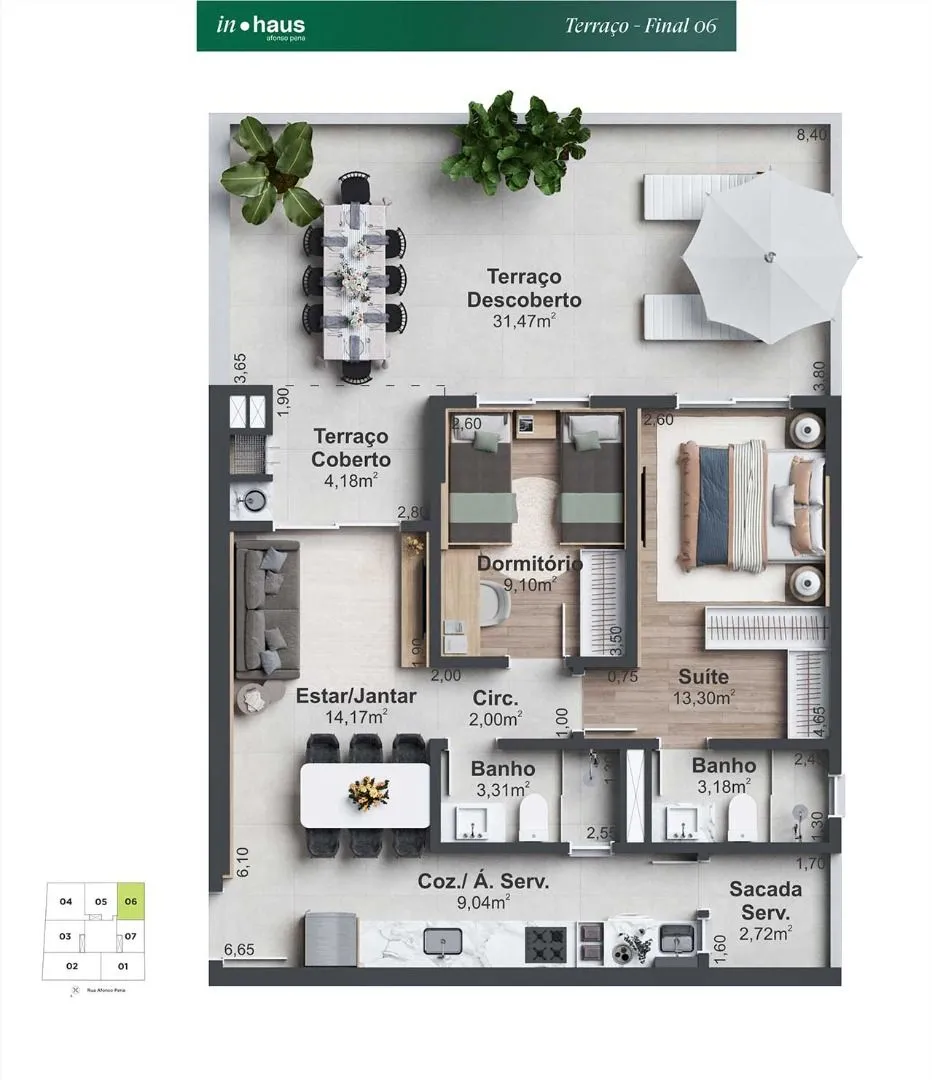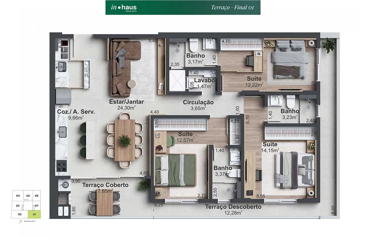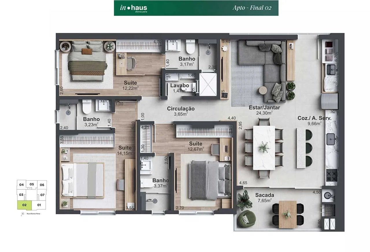 3 suítes + 1 lavabo, 2 dormitórios sendo 1 suíte.