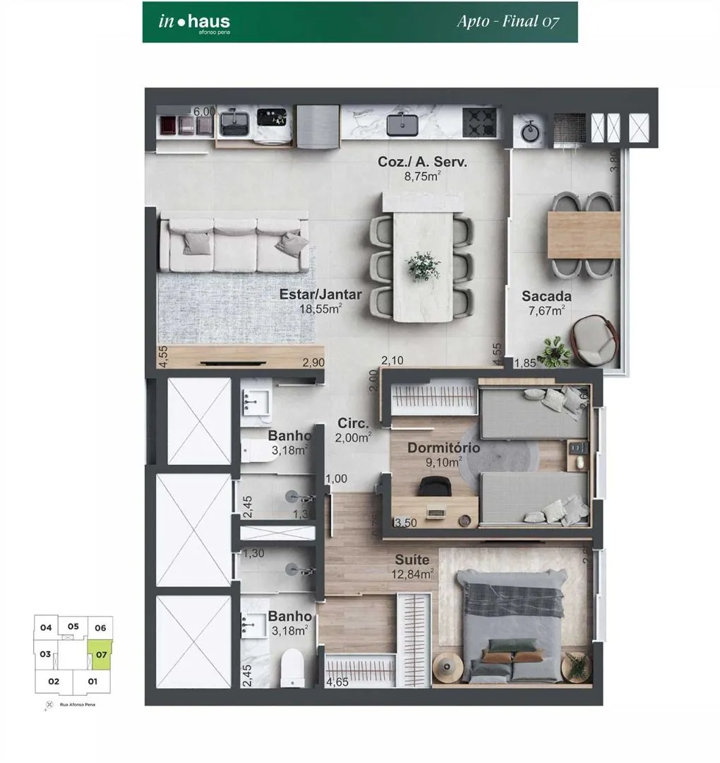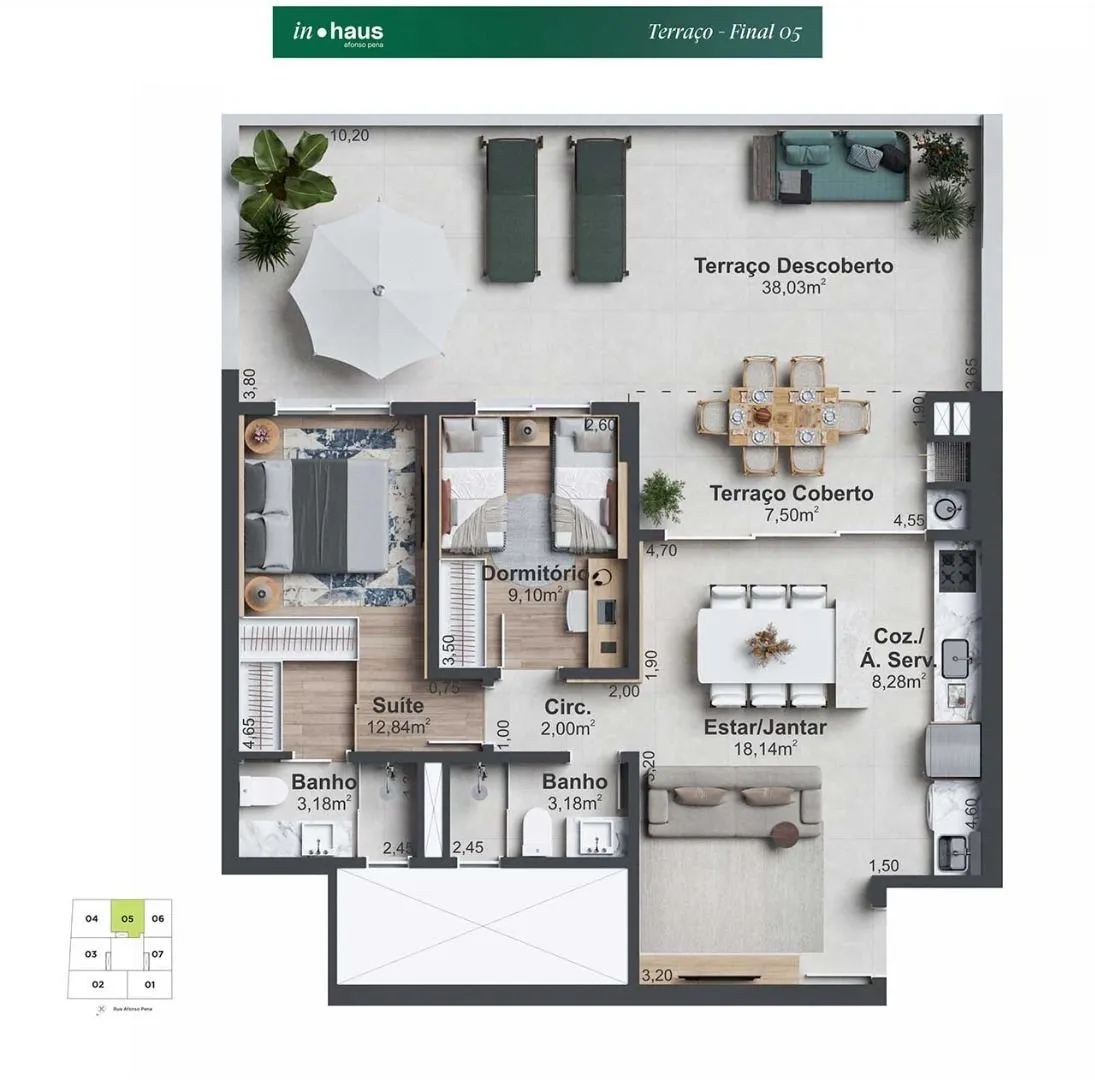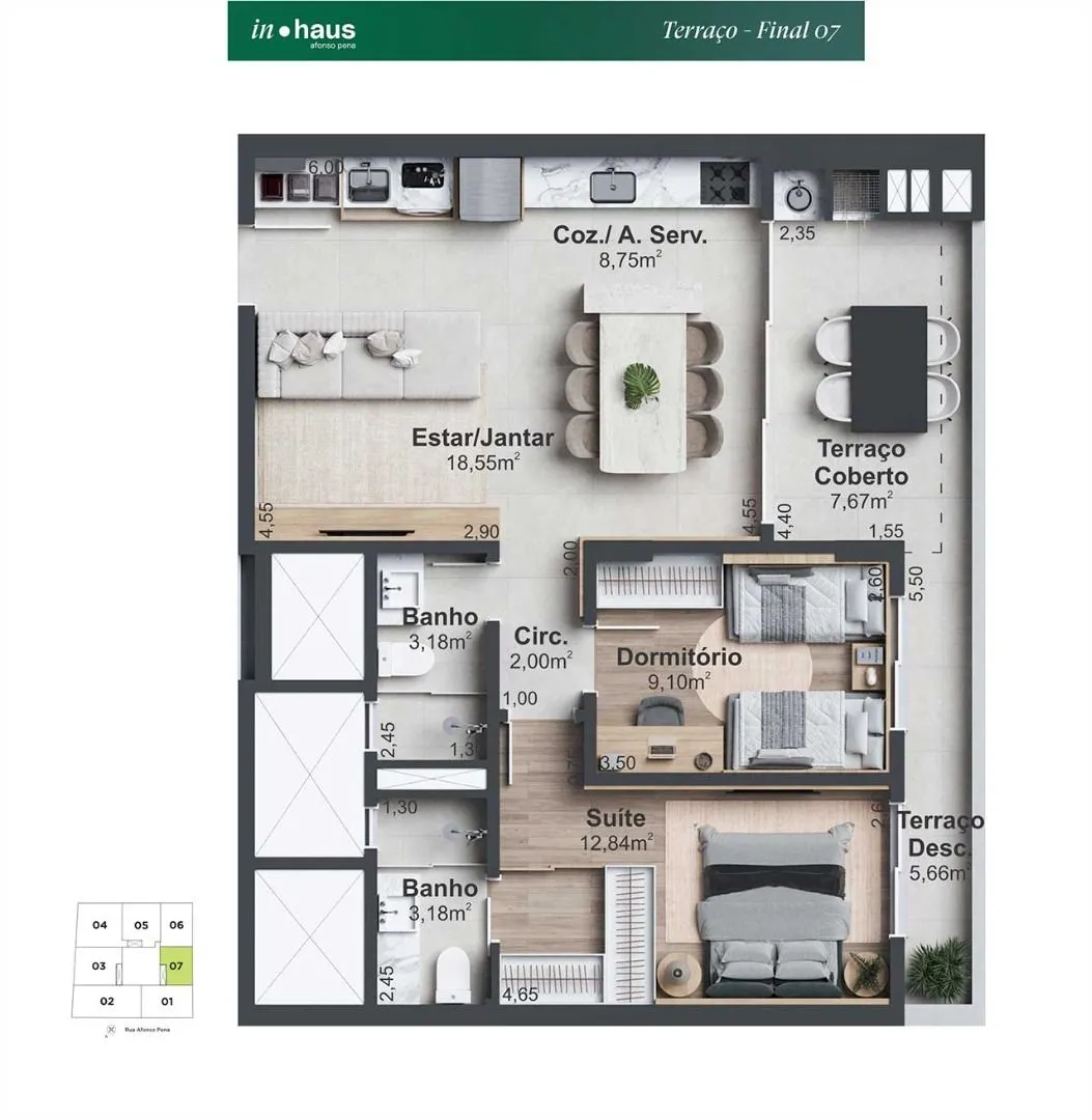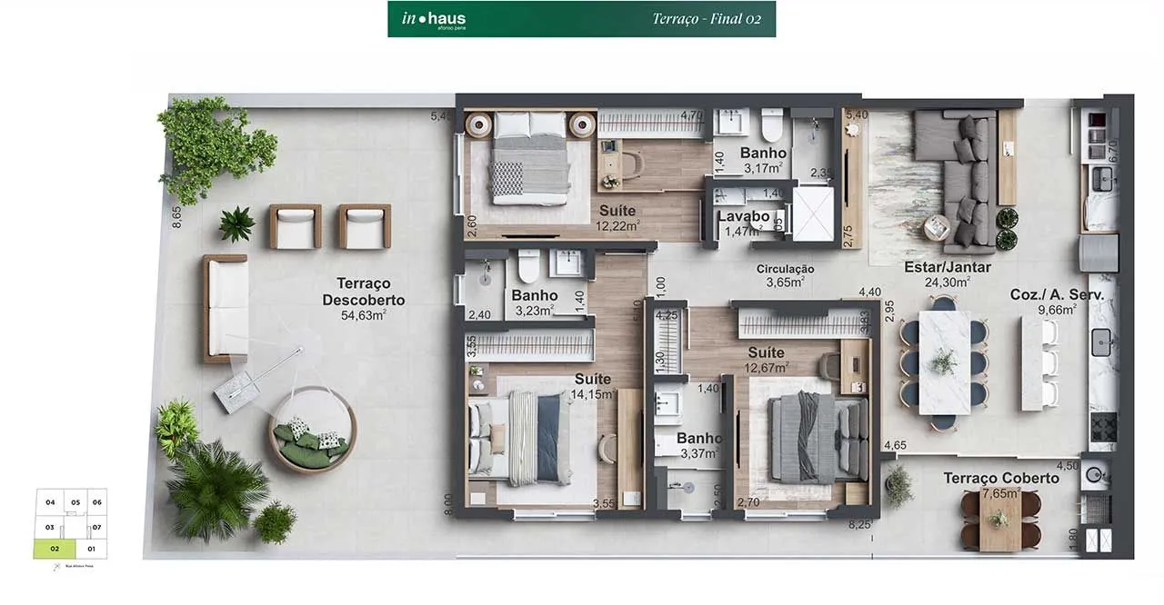 Área social mobiliada e decorada, 2 elevadores, Medidores individuais de água e gás, Monitoramento de áreas estratégicas do condomínio com câmeras de resolução HD, Reconhecimento Facial no controle de acesso das áreas comuns, Home box para todos os apartamentos, Vagas de garagem com infraestrutura para carros elétricos, Visitantes com 04 vagas de garagem, Sala técnica para ar-condicionado, Acesso individual dos pavimentos de garagem. Portões de garagem sistema jetflex (abertura e fechamento rápido) Espaço Fitness, Academia ao ar livre, Espaço Zen, Lounge com lareira, Piscina com borda infinita, Quiosque com churrasqueira, Sala de jogos com espaço gourmet, Horta compartilhadak Controle de acesso com clausura para segurançak Infra para armário inteligente, Hall de entrada mobiliado e decorado, Work Space compartilhado, Salão de Festas, Espaço Kids, Home Market, Lounge com lareira.
