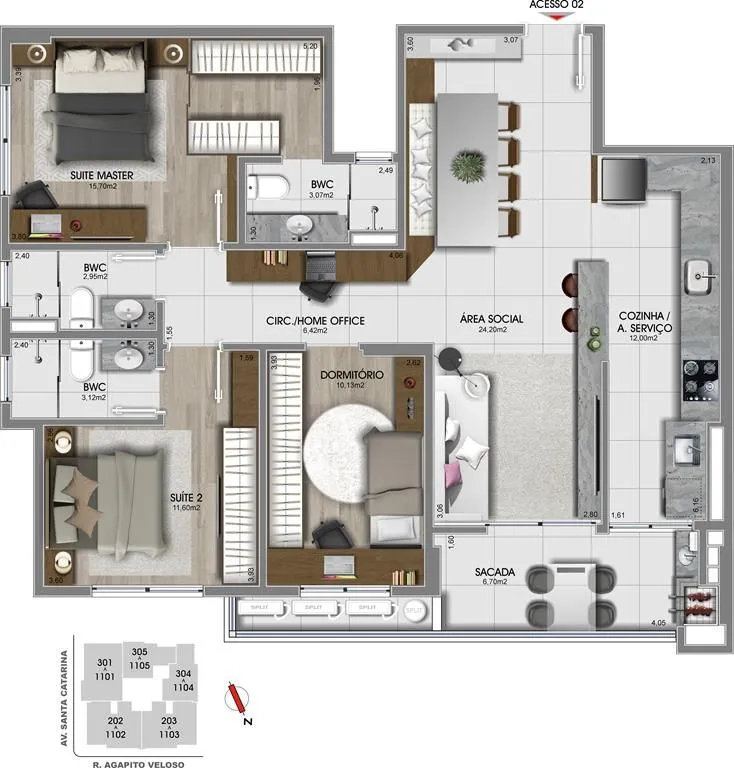 Morar bem é ter uma vida mais leve e poder contar com mais facilidade e mobilidade acima de tudo.Um empreendimento que oferece à você opções para escolher o lar que representa os seus sonhos e a melhor mudança em sua vida.2 dormitórios com 1 suíte3 dormitórios com 2 ou 3 suítesEspera para Split na área social e suítesPiso vinílico nas suítes e porcelanato na área socialVentilação cruzada e ótima orientação solarSacada integrada a cozinha e área social em todos apartamentos Condomínio: Vaga de garagem para 2 veículos nos apartamentos de 3 dormitóriosBicicletárioIluminação com lâmpadas de LED nas áreas comunsSensores de presença nas áreas comuns internasReaproveitamento de água da chuvaÁrea de lazer localizada na cobertura com ambientes entregues mobiliados, decorados e climatizadosPronto para morar!*Os valores e a disponibilidade estão sujeito a alterações sem aviso prévio!